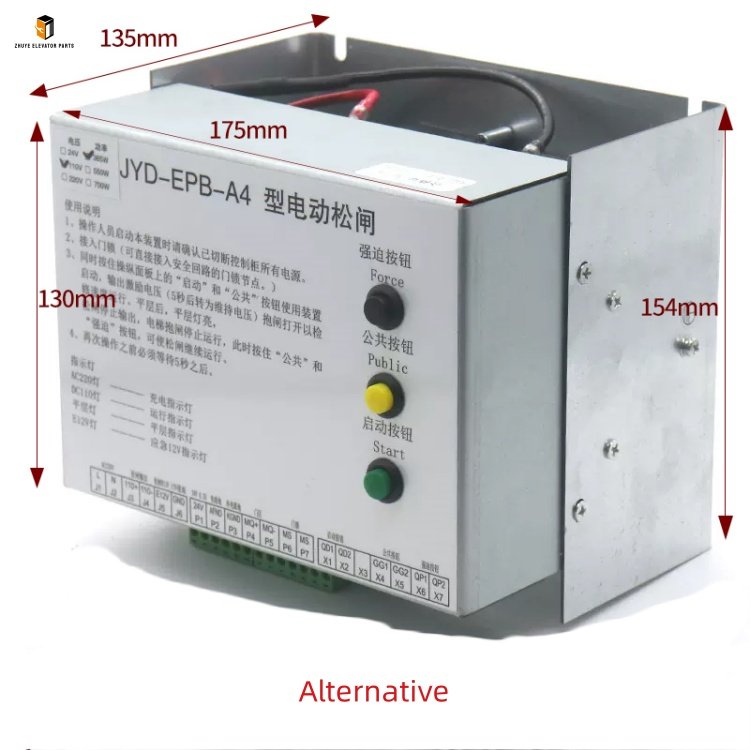 Nanjing Zhuye Elevatorparts adheres to the core philosophy of “safety first, quality paramount” and implements strict quality control over the EMK-EPB110 Electric Brake Release Device. Each unit undergoes multi-stage pre-delivery inspections, including brake release performance testing, response time verification, electrical insulation detection, and long-term durability trials. The product adopts advanced electromagnetic control technology, a flame-retardant ABS shell (UL94 V0 rating), and a double-protection circuit design: the electromagnetic control module ensures fast brake release (response time ≤ 0.1s) and reliable engagement, with stable performance under voltage fluctuations; the flame-retardant shell and IP54 dustproof and waterproof rating adapt to the humid, dusty, and vibrating environment in elevator machine rooms; the double-protection circuit (overvoltage, overcurrent protection) prevents device damage caused by electrical faults. Its standardized wiring interfaces and mounting dimensions are tailored to most mainstream elevator traction machines, eliminating the need for complex modifications and enabling quick and safe installation.